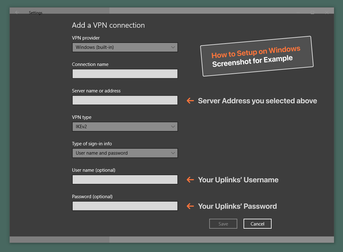 You can use Uplinks VPN without installing any client on Windows, only by creating a profile in the Windows Settings.